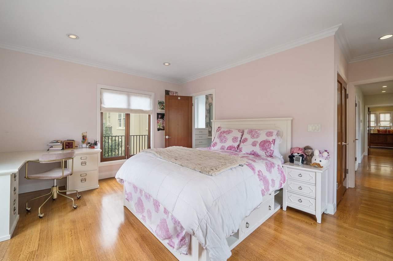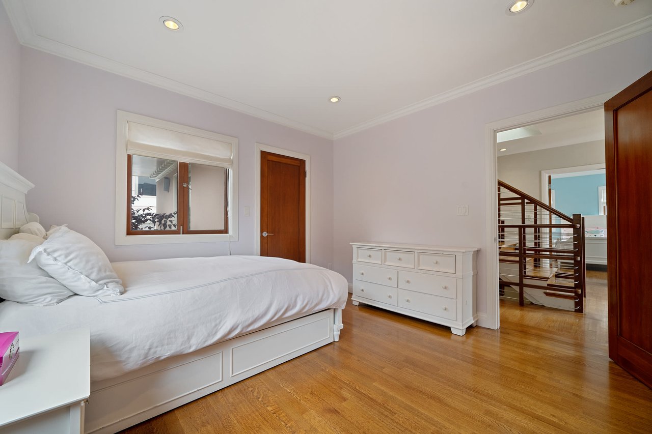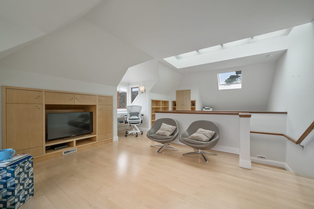The third floor features a stunning light-filled media room, study, fourth full bath and center skylight. This versatile level can also be used as guest quarters, recreation room, or children’s playroom. The backyard displays a charming rear patio, lovely landscaped garden and detached garage with additional parking in driveway.