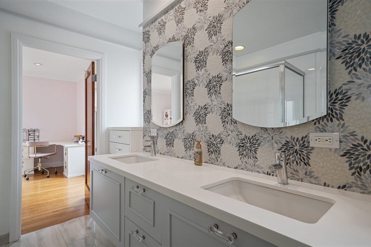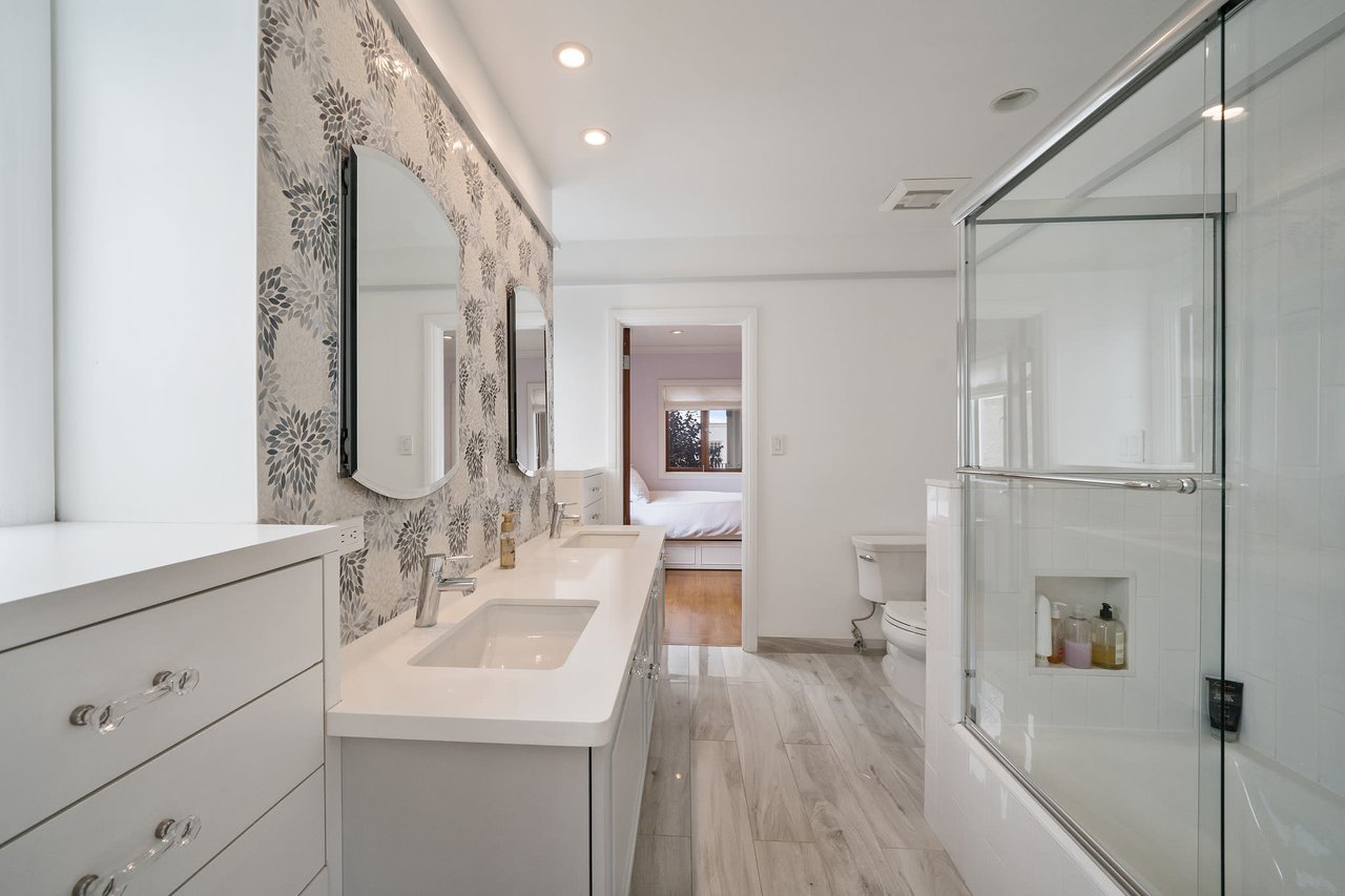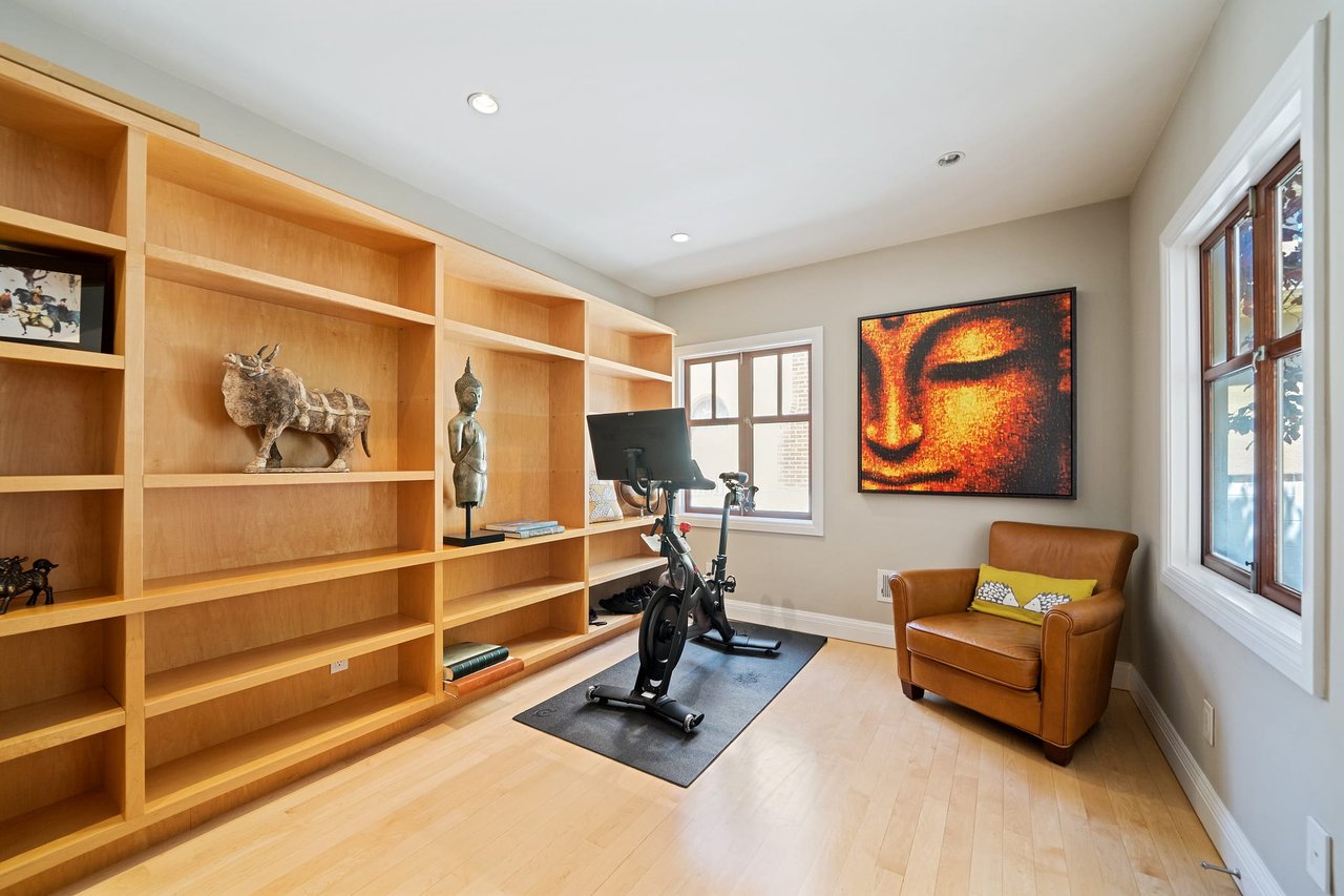 The third floor features a stunning light-filled media room, study, fourth full bath and center skylight. This versatile level can also be used as guest quarters, recreation room, or children’s playroom. The backyard displays a charming rear patio, lovely landscaped garden and detached garage with additional parking in driveway.
