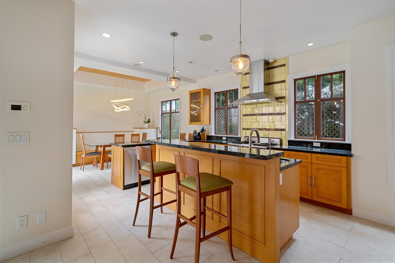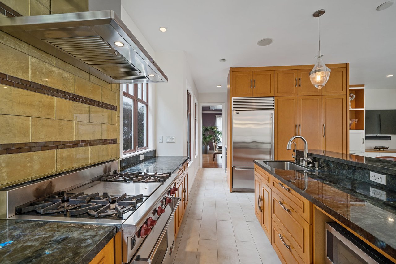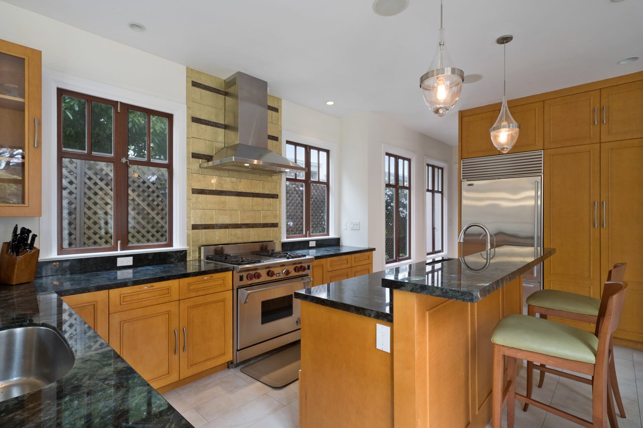 This exceptional light-filled home features three floors of spectacular living space. The grand living room boasts three sets of French doors, recessed lights, and hardwood floors. The elegant formal dining room displays a warm and inviting presentation perfect for entertaining. The beautifully remodeled gourmet kitchen features a Wolf gas range with hood, Sub-Zero refrigerator, custom cabinets, gorgeous pantry and comfortable breakfast area with French doors opening to a walk-out patio and garden.