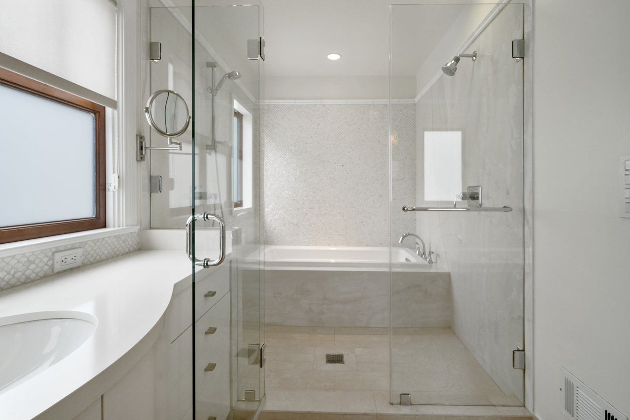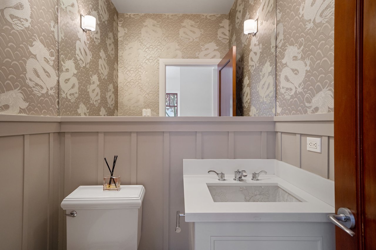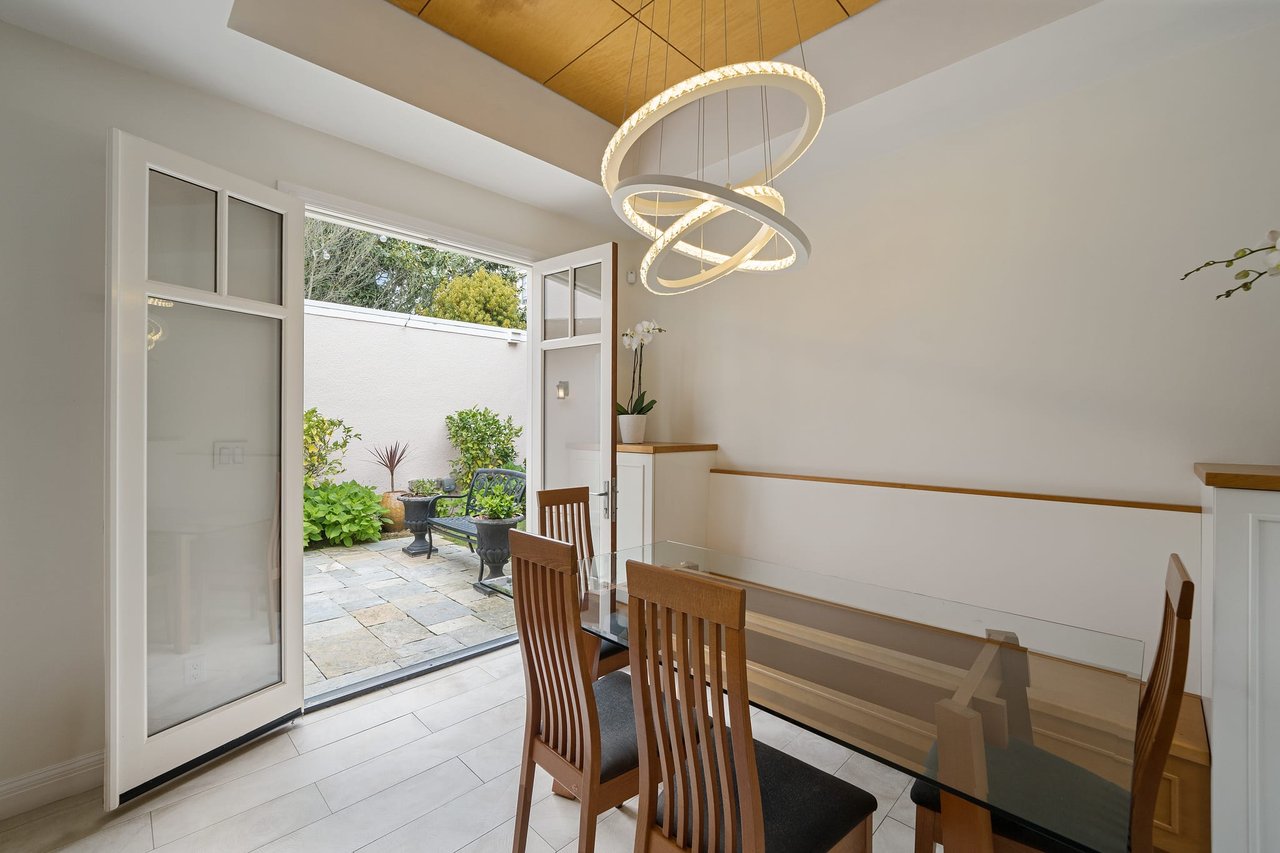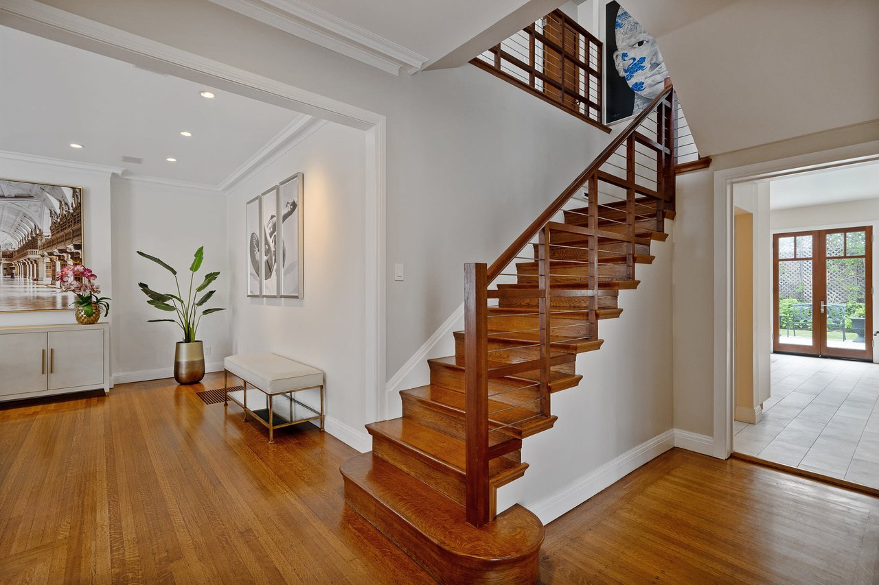 This exceptional light-filled home features three floors of spectacular living space. The grand living room boasts three sets of French doors, recessed lights, and hardwood floors. The elegant formal dining room displays a warm and inviting presentation perfect for entertaining. The beautifully remodeled gourmet kitchen features a Wolf gas range with hood, Sub-Zero refrigerator, custom cabinets, gorgeous pantry and comfortable breakfast area with French doors opening to a walk-out patio and garden.