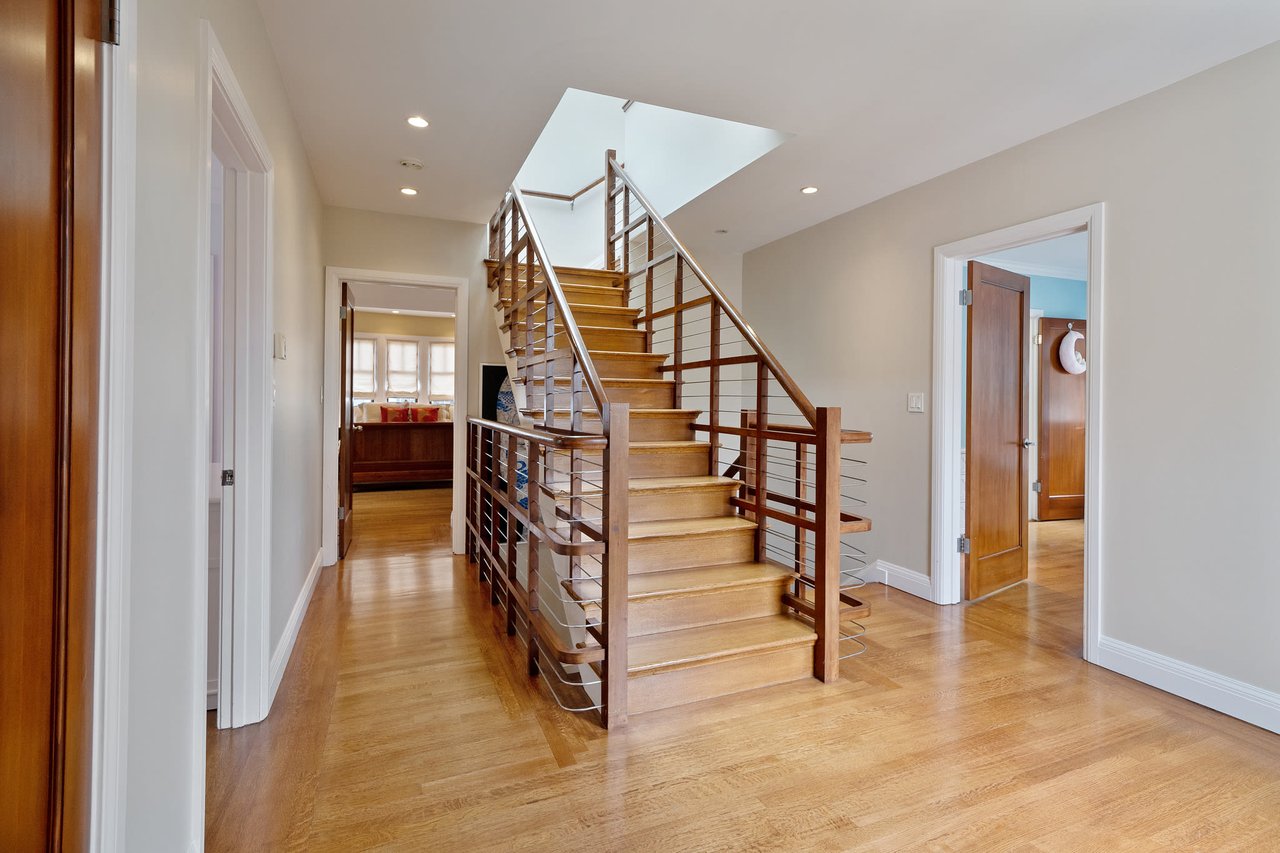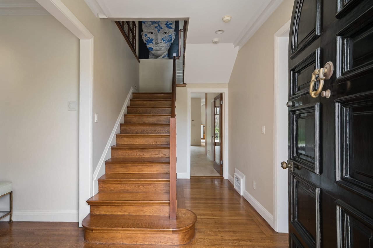 The spacious family room with custom cabinetry and incredible natural light has direct access to the rear patio & garden. A fabulous office/library with built-in bookshelves and powder room complete this first floor. A handsome open banister staircase ascends to the second floor and landing. The spectacular primary suite with vaulted ceiling features a large walk-in closet and private bath with separate shower and tub. Three large bedrooms, two remodeled baths, and a laundry closet finish off this superb family living level.
